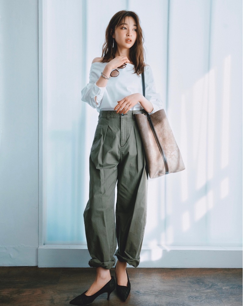 10月23日(木)、ミリタリーライクなカーキのパンツに、あえての黒パンプスとオフショルの白トップスを合わせて。マニッシュなパンツに、肌見せや華奢なパンプスをMIXすることで、今っぽい抜け感をプラスできます。フェミニン×ミリタリーのバランスが絶妙な、甘すぎない女っぽさを意識したヘルシーコーデです。