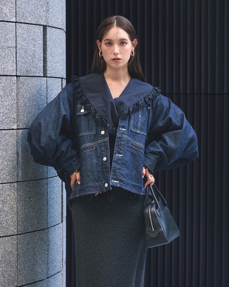 10月25日(土)、大ぶりなセーラーカラーをデニムジャケットからのぞかせて、トレンド感をひとさじ。一見ガーリーすぎる?と思いきや、デニムの素材感が甘さを程よく引き締めてくれます。黒レザーのバッグとシルバーアクセで辛口エッセンスをプラスすれば、大人にちょうどいいバランスの“甘辛ガーリー”が完成です。