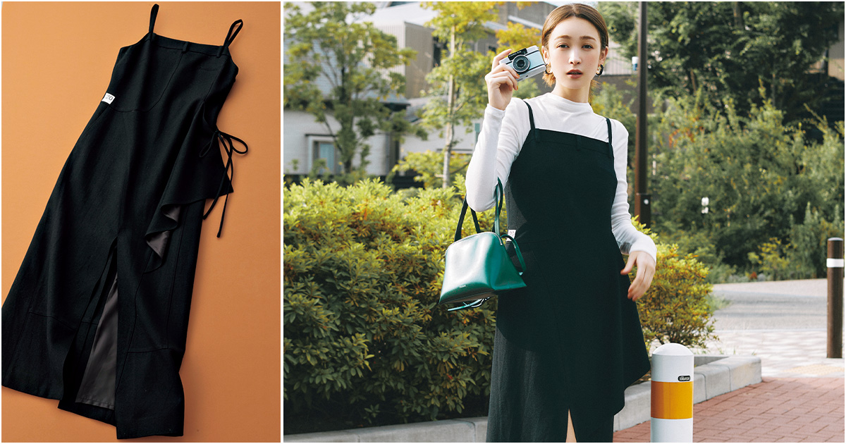 地厚な生地をたっぷりと使用した一枚で様になるキャミワンピ。腰回りにある大きめフリルやリボン、深めのスリットが程よい女性らしさを演出してくれます。ワンピース¥99,000(RE;CODE/THIRD MAGAZINE)
