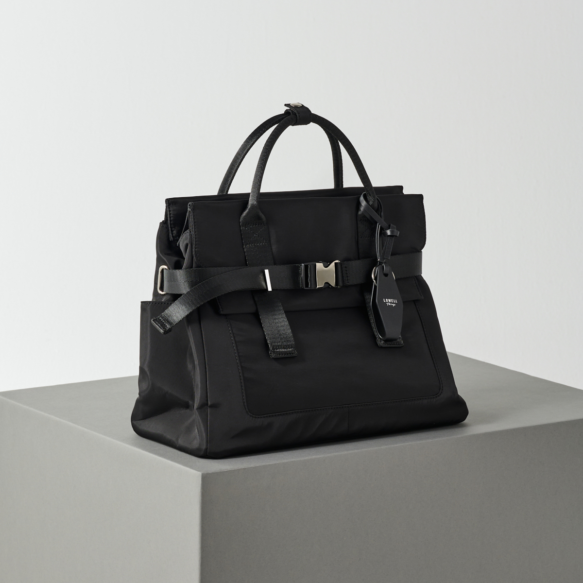 毎日の通勤をストレスフリーにしてくれる、ヨコ型ナイロントート。A4サイズや13インチPCがすっきり収まる容量で、書類や必需品をまとめて持ち歩けます。フロントやサイド、内側にもポケットがあるので整理整頓もラク。ロゴ入りのキーチャームがさりげないアクセントになっています。背面はキャリーケースにセットできる仕様で、出張や旅行シーンにも対応。タフなナイロン素材にシルバー金具を合わせたミニマルなデザインで、きれいめな通勤服とも好相性です。