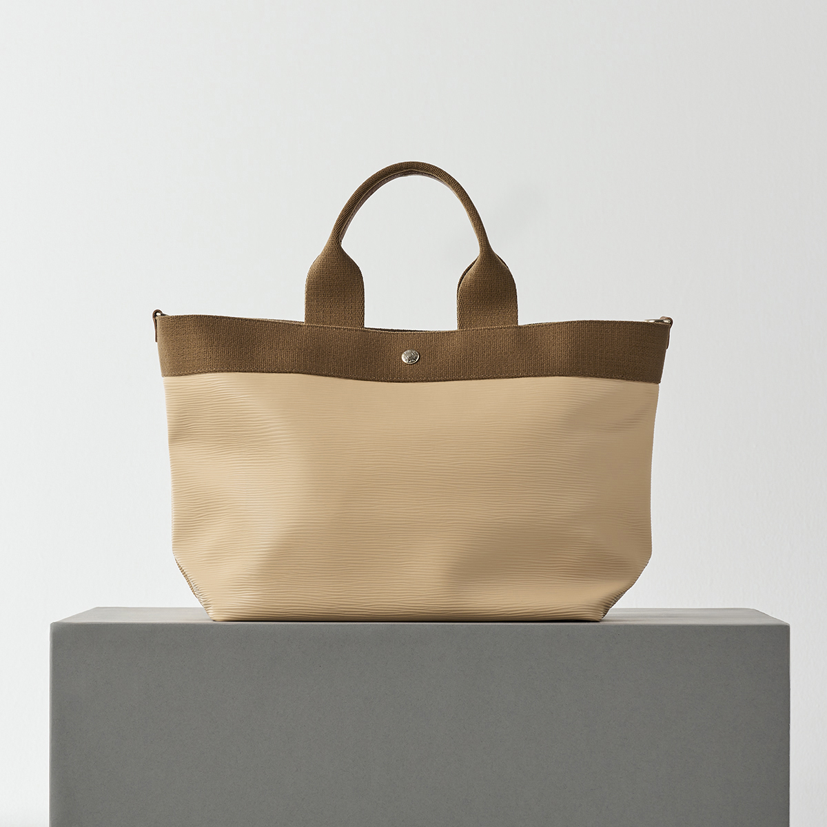 毎日の通勤にちょうどいい軽さとサイズ感、きちんと感を兼ね備えた、トプカピの「リプル A4 トート」。A4書類やPCがすっきり収まるサイズで内ポケット付きという実用性と、品よく見える型押しPVC素材のバランスが絶妙です。傷がつきにくい素材なので、長く愛用することが可能。ハンドルは短めで手持ちにした時のシルエットもスマートです。ショルダーストラップをつければ、移動の多い日にも◎。イエロー×ブラウンのツートンカラーが、コーデに華やかさをプラスしてくれます。
