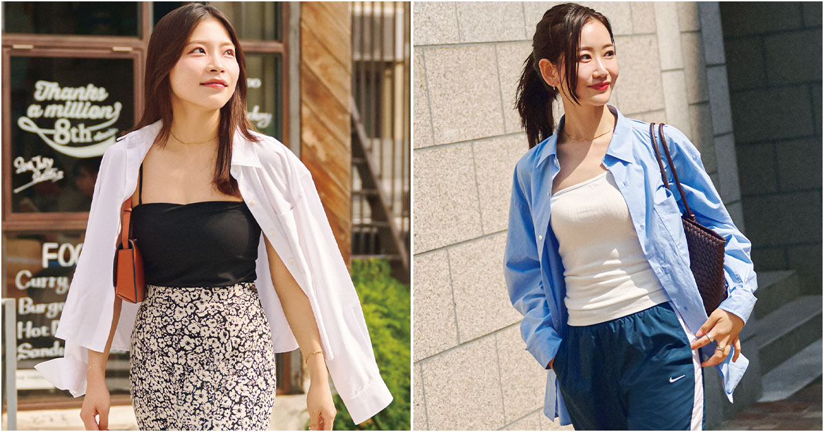 仕事終わりに友達とサウナ、からの夜お茶が最近の息抜き。着替えとして用意したナイキのナイロンパンツはバッグに入れてもかさばらないので機能的。トップスとシャツは通勤服をそのままシフトして、スポーツMIXを楽しんでいます。足元はマノロのヒールで女っぽさをプラス。ザラのカゴバッグは軽くて丈夫だから、サウナの荷物も余裕で入ります。