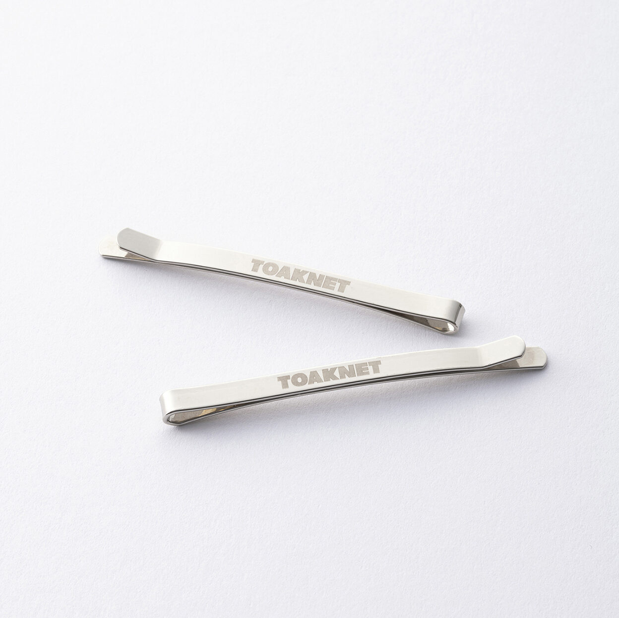 韓国で今HOTなヘアアクセブランド「TOAKNET(トークネット)」。ロゴが刻まれたモード味のあるシルバーピンは、甘派コーデに大人っぽさをプラスしてくれます。ヘアピン各¥3,000(ともにTOAKNET/ジュンカスタマーサービス)