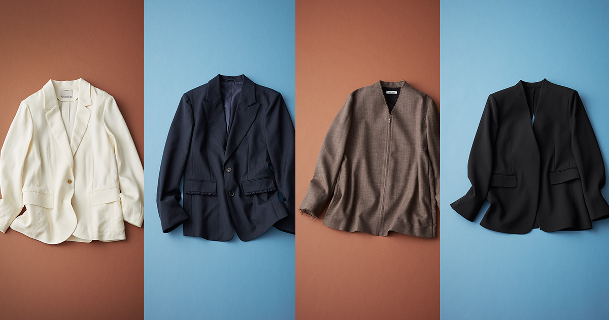 昨年デビューしたばかりながら、フェミニンな上品さと仕立てのよさで、CLASSY.読者からも絶大な支持を得るconte(コンテ)。一日中社内で締切りに追われる日は、あえて華やかに白のテーラードジャケットで気分を上げて。一枚仕立てで着心地も◎です。