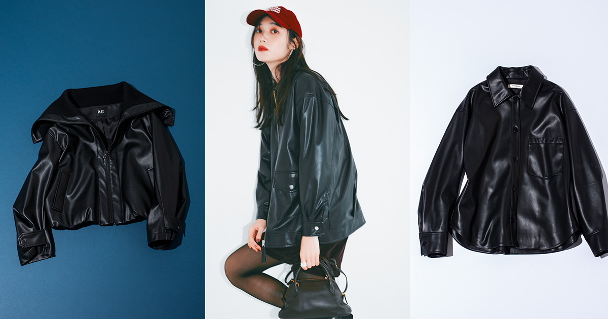 ブランドで人気のレザースカート。今年はジャケットもレザーが登場。艶感のあるフェイクレザーは、しなやかでハードになりすぎない。絶妙な落ち感とオーバーシルエットで、オンオフ問わず活躍。