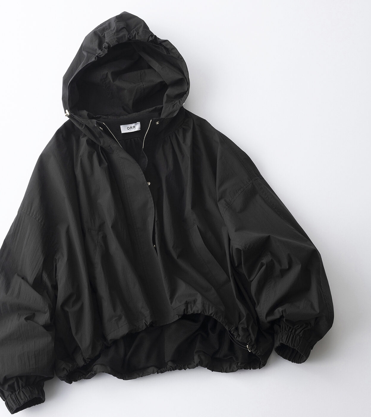ラウンドヘムシルエットやドルマンスリーブ、首元やフードのギャザーなどところどころに女性らしいデザインが詰まった1着。オーバーサイズで軽量なナイロン素材がトレンドのスポーティさを演出してくれます。ブルゾン¥40,362(参考価格)(ORR/HANA SHOWROOM)
