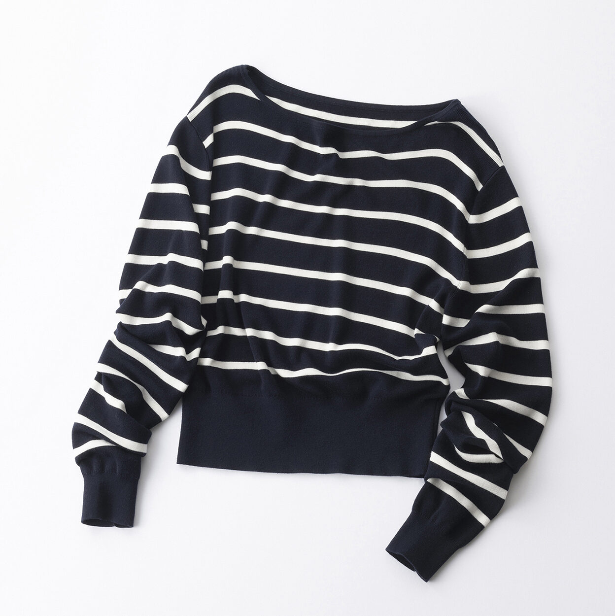 デコルテ周りがスッキリしているため小顔効果も期待できるネイビーのボーダーニット。ウエストの裾リブがお腹周りをキュッと引き締め、ボトムスにインしてもしなくてもスタイルアップが叶います。ニット¥22,269(参考価格)(ORR/HANA SHOWROOM)