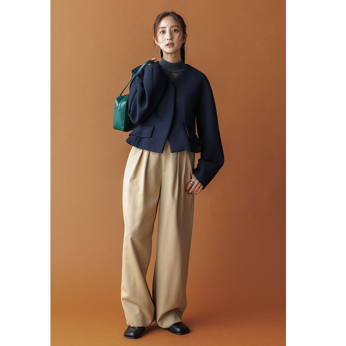 ドロップショルダーとウエストシェイプが効いたコンパクトなジャケットは、羽織るだけでスタイルアップが叶う1枚。タック入りのチノパンと合わせてもすっきり見え、通勤スタイルを新鮮にアップデートしてくれます。真面目なネイビー×ベージュの配色ながらかっちりしすぎず、退勤後そのまま出かけられる軽やかさも◎。