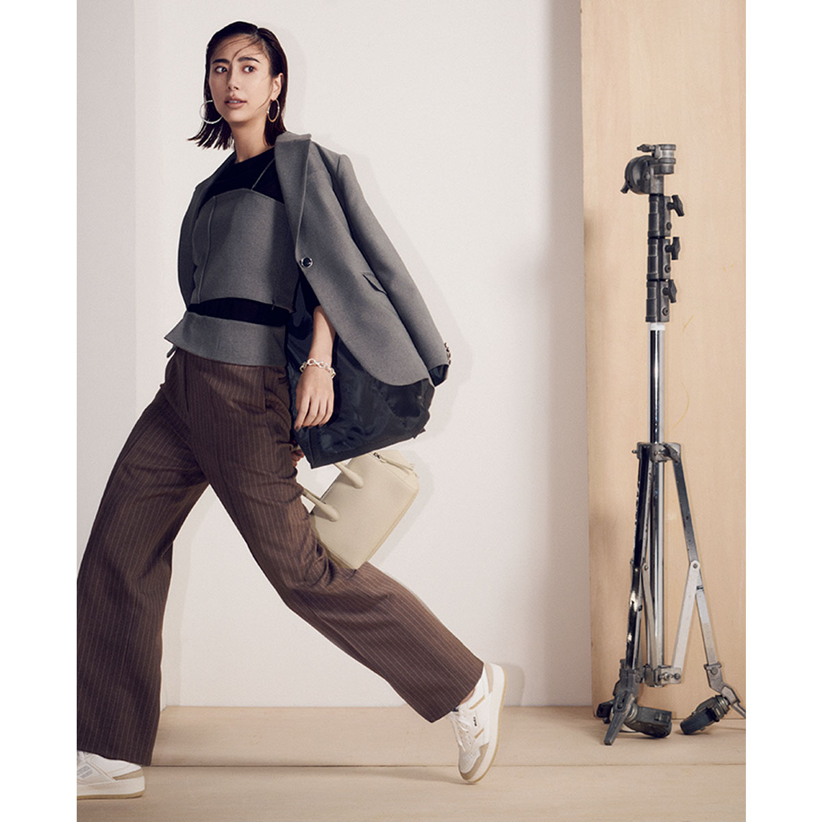 グレーのジャケットにビスチェを重ねた立体的な上半身に、ブラウンのストライプパンツを合わせて全体をシャープに。かっちり見えする組合せながら、足元のスニーカーで肩の力を抜けば、グッとこなれた印象に導けます。オフィスでも街でも映える、大人のキレイめカジュアルに着地。