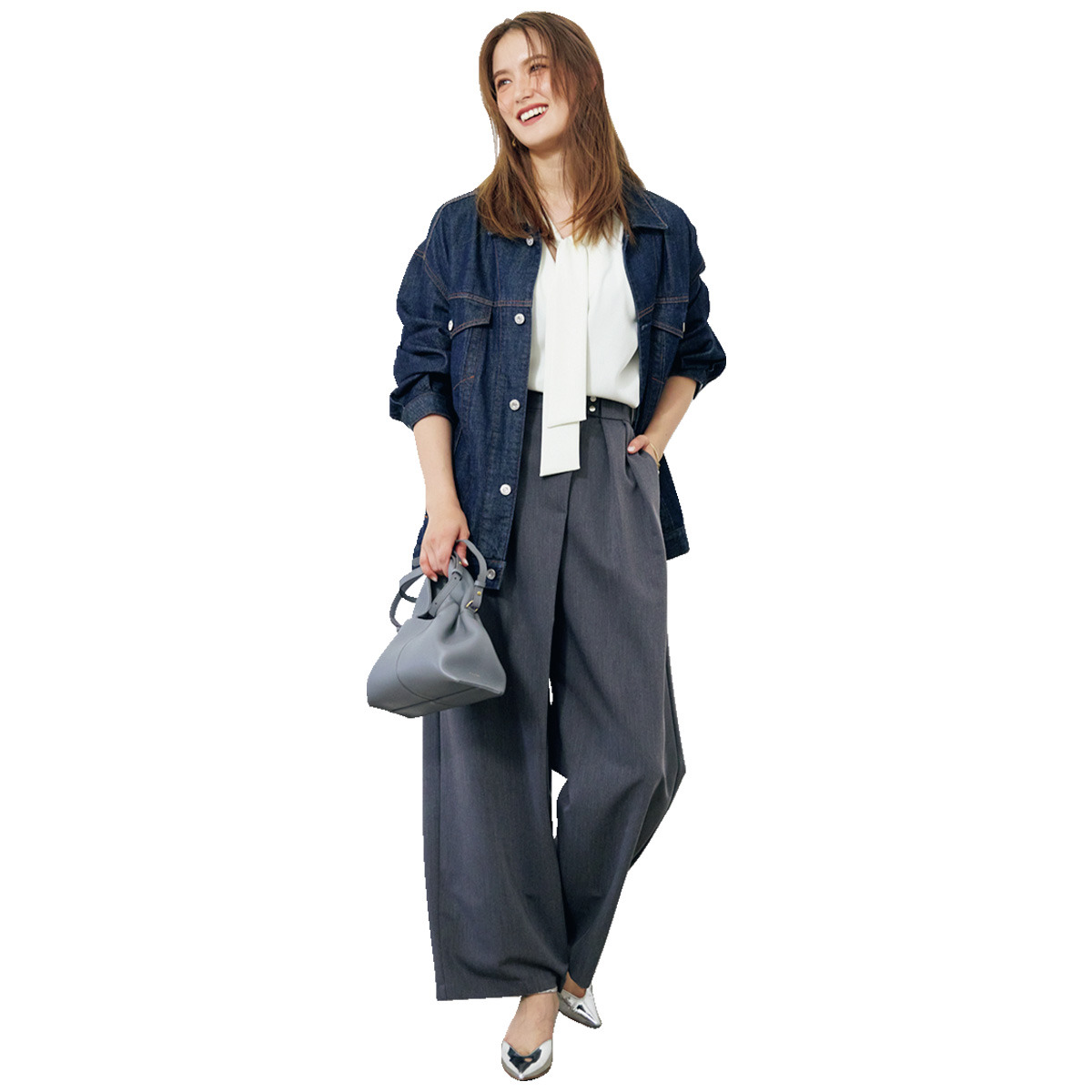 カジュアル度高めのデニムジャケットも、濃紺を選べばお仕事コーデになじむ優秀アウターに。端正なボウタイブラウスとグレーのワイドパンツに重ねれば、“キレイめながらもかっちりしすぎない” 絶妙なバランスが叶います。シルバーパンプスでツヤを添えて、品よく軽快なオフィカジにアップデート。