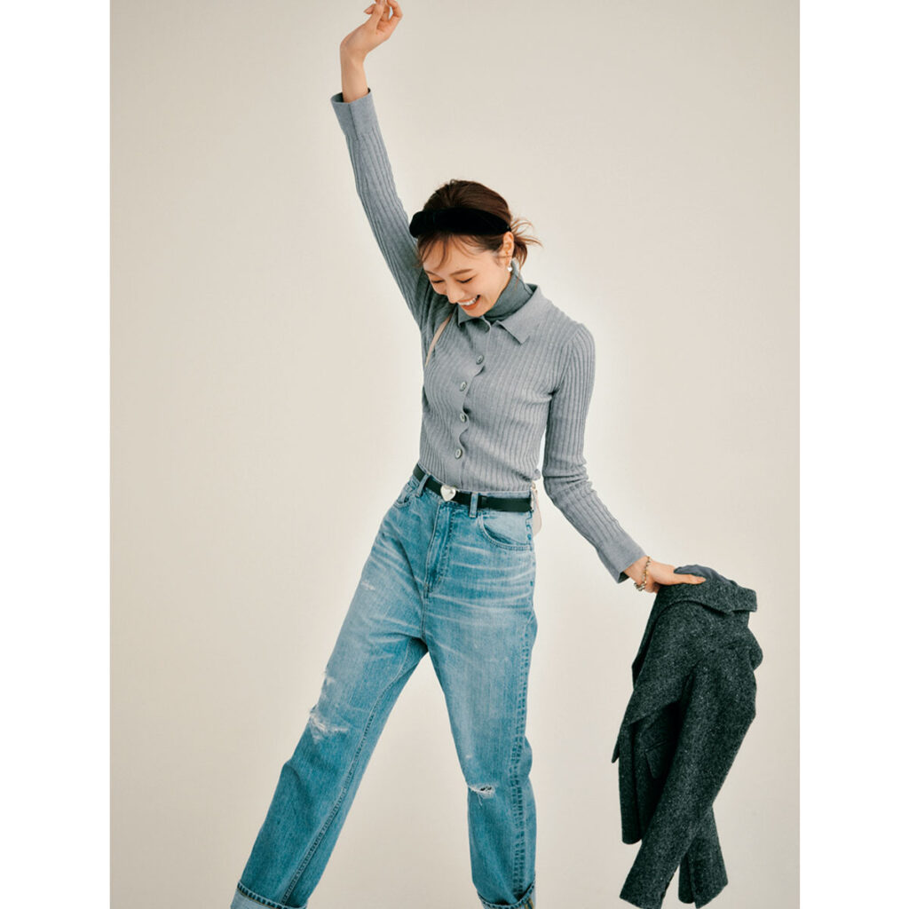 流行中のポロニットは、タートルINで上級見えを狙って。首元に立体感が出ることで、シンプルなデニムスタイルも一気に今年らしいムードに着地します。ブルー×グレーの寒色トーンでまとめれば、カジュアルでもどこか上品な仕上がりに。ウエストの黒ベルトで全体を引き締めて、ゆるシルエットにほどよい緊張感をプラス。