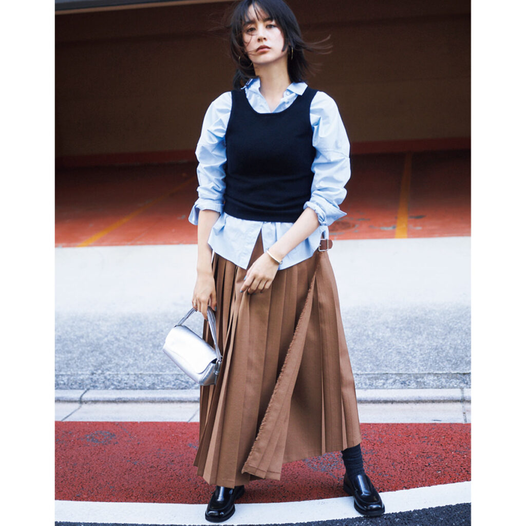 仕事上がりに女子会の予定がある日は、上着を脱いでもサマになる装いで出かけたい!シャツ×ニットタンクの組合せなら、肩の力を抜きながらも品よく整います。ブルーシャツとブラウンスカートの配色が優しげで、職場でも好印象が狙えそう。ローファーで今どきトラッドにすれば、夜まで楽しめる通勤コーデが完成。