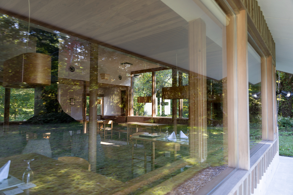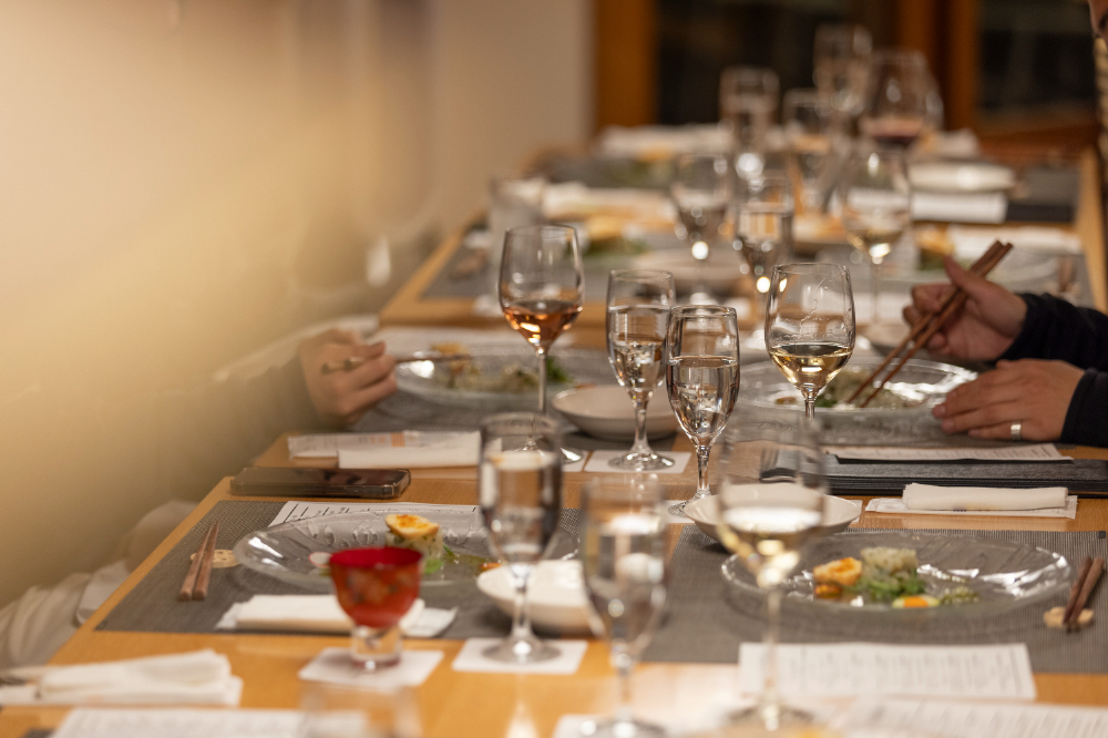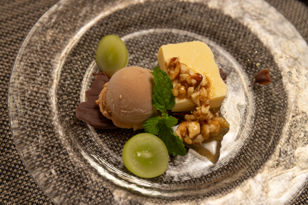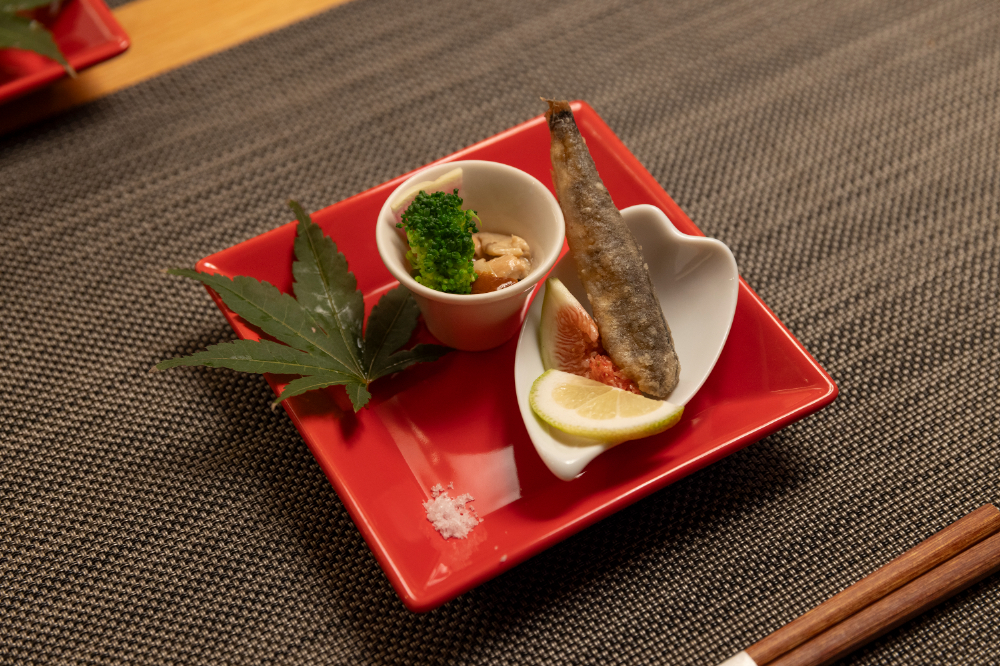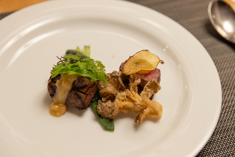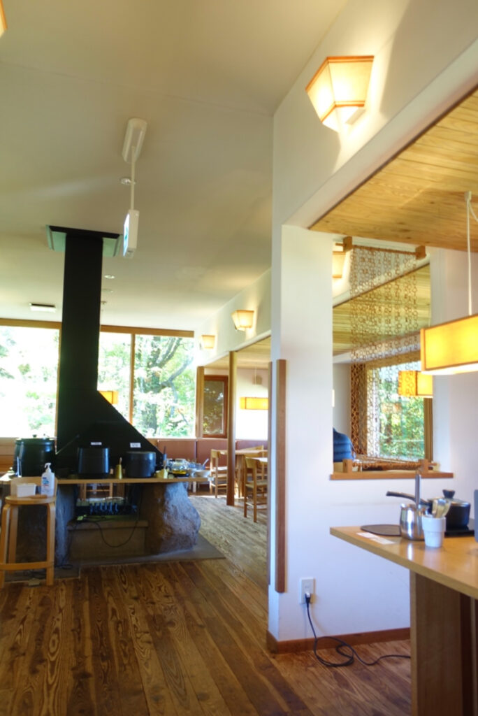 夜は「お福分け」と名付けられた、地元食材たっぷりのコースをいただきます。ひと皿ずつ丁寧に盛り付けられた料理には、旬の野菜や山の幸、川や海の幸がふんだんに使われ、口にするたびに心まで満たされるような味わい。暖炉を囲むように配置されたテーブルで、静かな空間の中、自然と調和したホテルならではの贅沢なひとときをゆったり楽しみます。