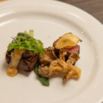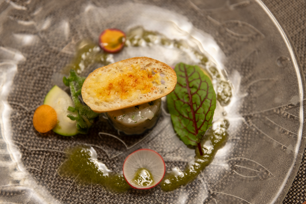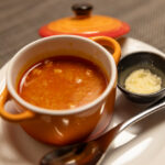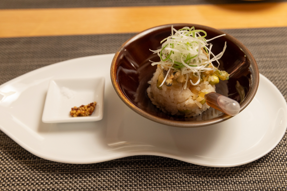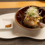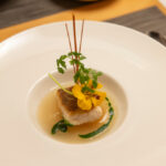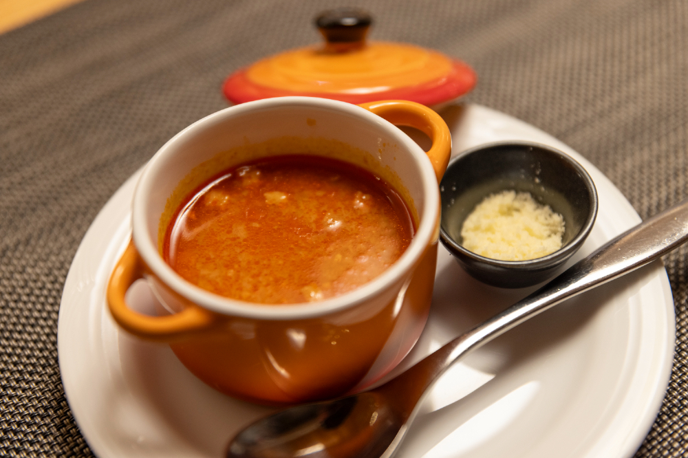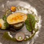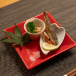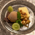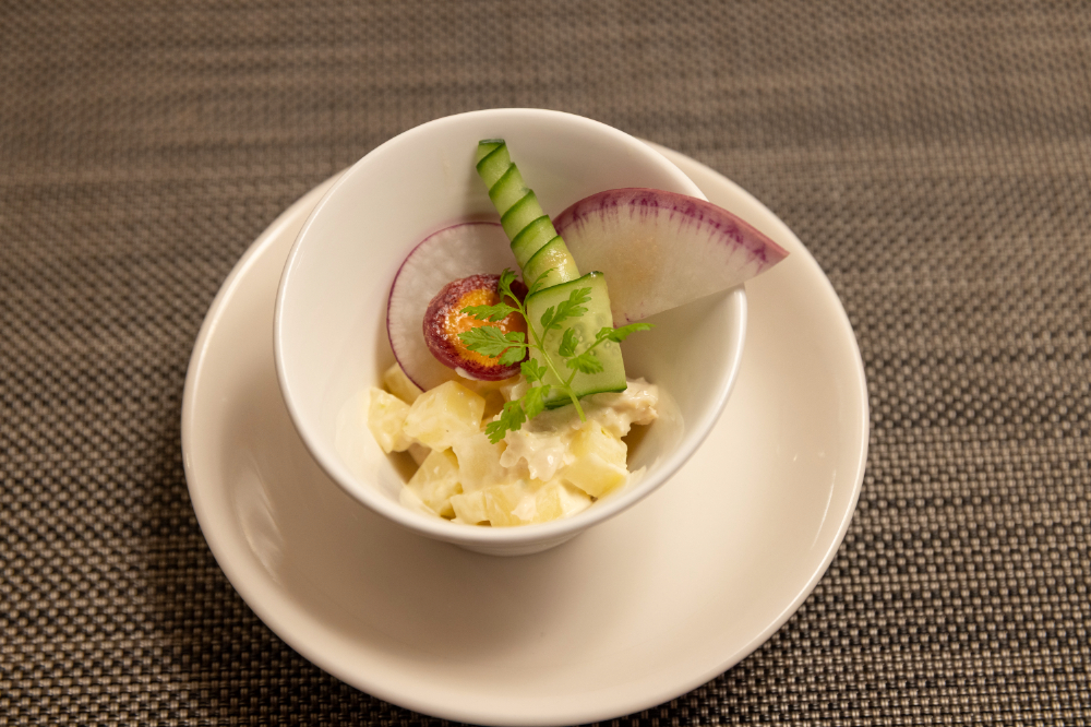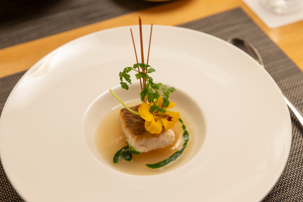 夜は「お福分け」と名付けられた、地元食材たっぷりのコースをいただきます。ひと皿ずつ丁寧に盛り付けられた料理には、旬の野菜や山の幸、川や海の幸がふんだんに使われ、口にするたびに心まで満たされるような味わい。暖炉を囲むように配置されたテーブルで、静かな空間の中、自然と調和したホテルならではの贅沢なひとときをゆったり楽しみます。