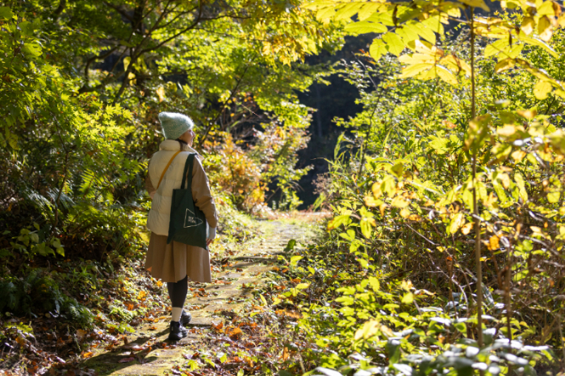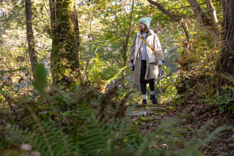「Trailwinder Mid GTX」を履いて朝の森を散策。踏み込むたびに足裏へ心地よい反発が返ってくるような感覚で、次の一歩を軽やかにサポート。傾斜の多い森でのトレイルも、安定感のあるグリップ力のおかげでペースを落とさずに歩くことができます。