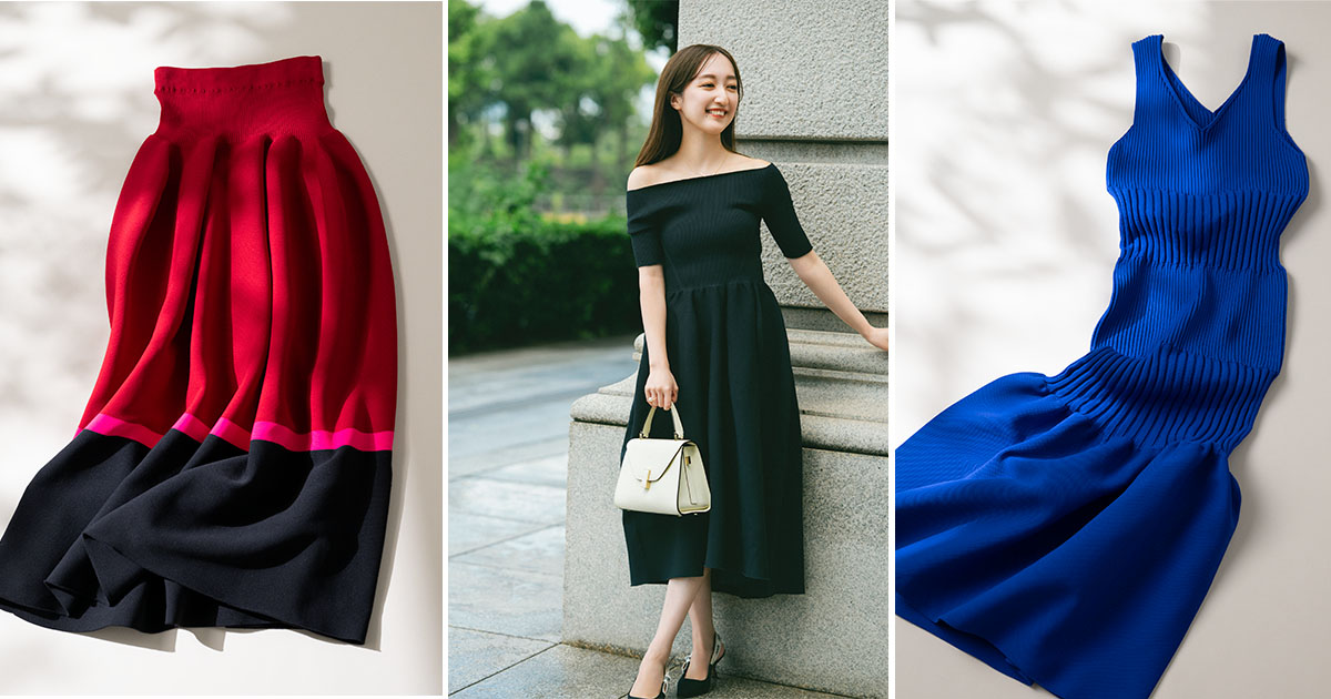 ストレッチ性の異なる2種類のリブを交互に編み、胸下と太ももあたりをすぼませたユニークなシルエットのドレス。裾は体から離れるガーター編みでマーメイド風に。ワンピース¥59,400(CFCL)
