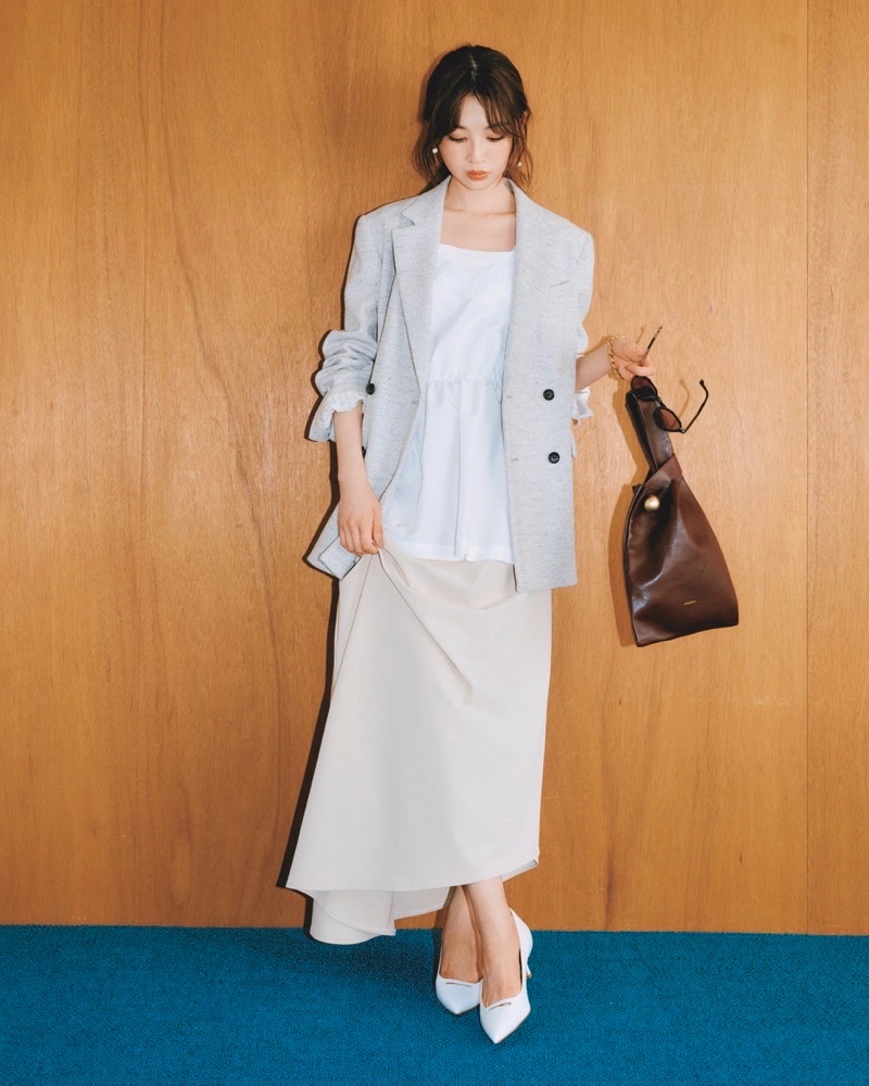 11月7日(金)、落ち着いた印象のライトグレーのツイードジャケットを主役に、あえて女性らしいインナーとボトムスを合わせて。程よく光沢のあるペプラムキャミソールが、ツイードのマニッシュさをやさしく中和します。落ち感のあるベージュのロングスカートと、甲の見える白パンプスでレディライクな仕上がりに。フェミニンとマニッシュが共存する、きれいめモードスタイル。