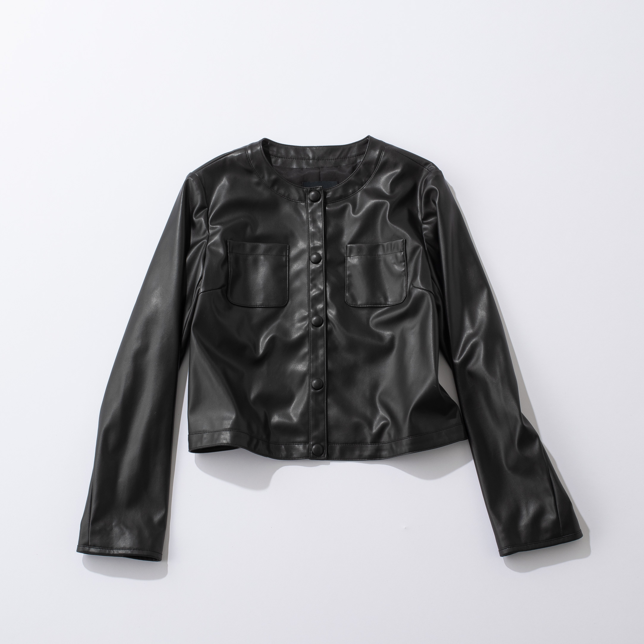 トレンドのフェイクレザーを使用した今どきな1着。どんなボトムスにも合わせやすい丈感が嬉しい!共布のくるみボタンの使用により上品な印象に。オンオフ問わず活躍すること間違いなし。ブルゾン¥20,900(ノーク)
