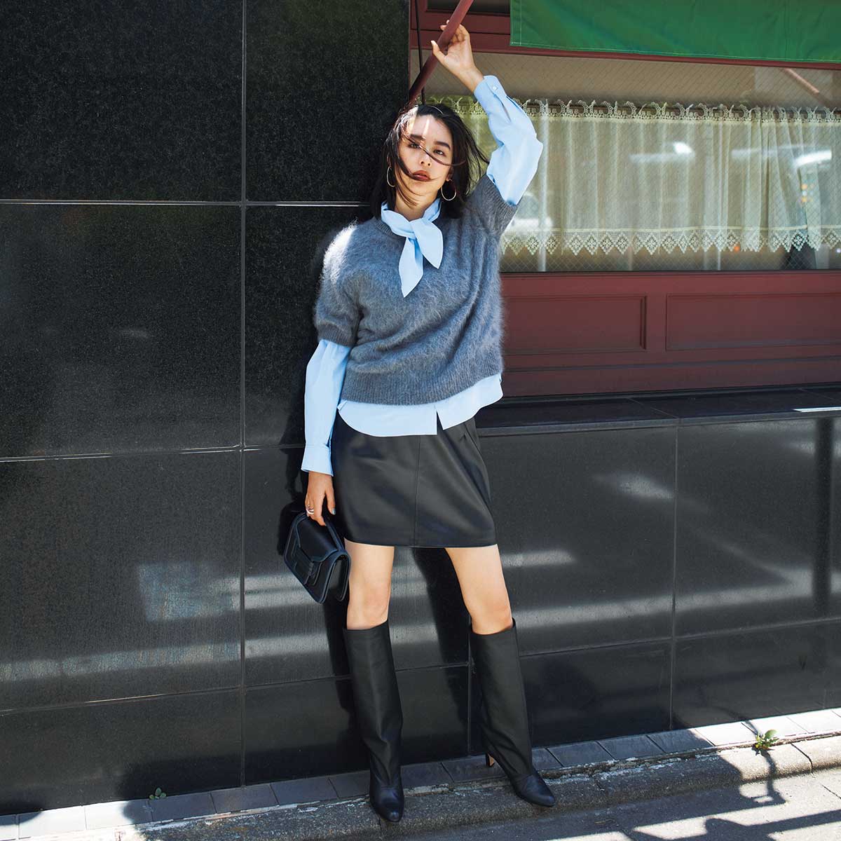 ボウタイシャツ×ファーニットの優しげスタイルに、レザーのミニスカでスパイスをひとさじ。黒のロングブーツで引き締めれば、脚見せも大人モードにシフト。クラシカルだけど媚びていない、今の気分にぴったりな甘辛ミックスに仕上がります。