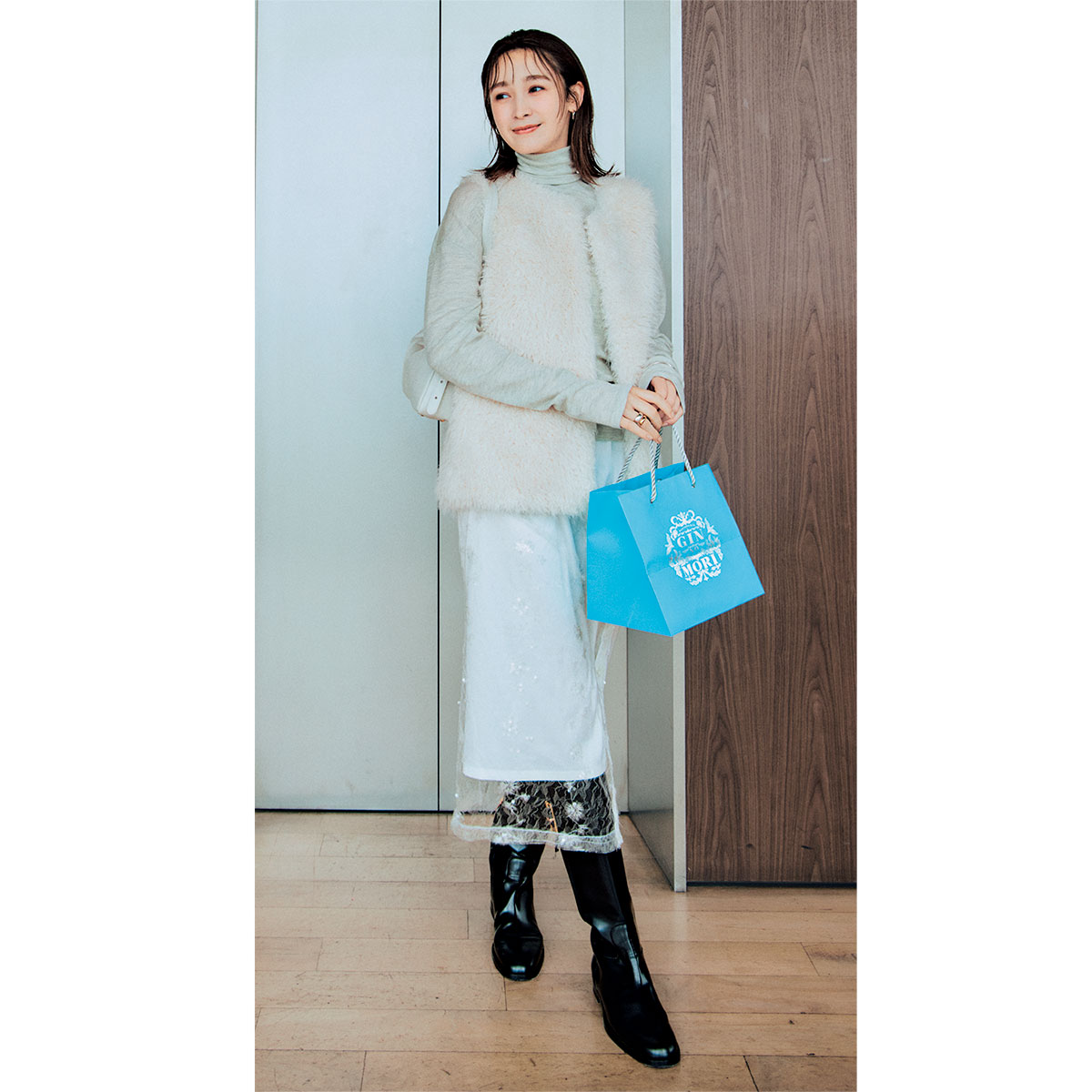 淡いグレーと白のワントーンでまとめた着こなしに、ファーベストでリッチな華やぎをプラス。透け感のあるスカートからのぞく黒ブーツが、全体をきゅっと引き締めて甘さをセーブします。お呼ばれや食事会など、冬の特別なシーンにもぴったり。