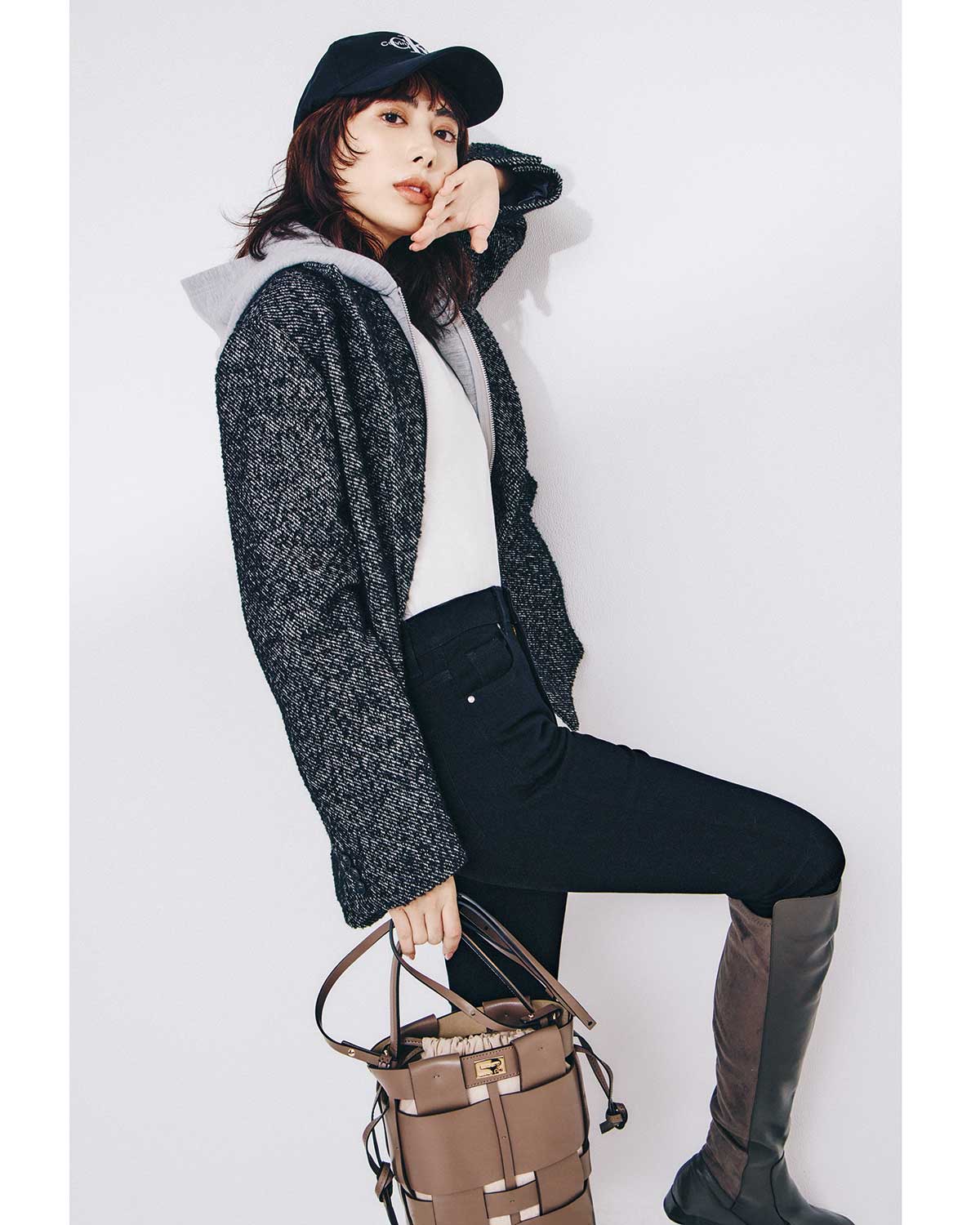 シックなモノトーンコーデを更新するなら、異素材のロングブーツを投入するのも手。ツイード×パーカの組合せにレザーが加わり、装いに表情が生まれます。脚のラインをすっきり整えてくれるのもうれしいポイント。バッグもブラウン系でリンクさせて、統一感のある大人カジュアルに導いて。