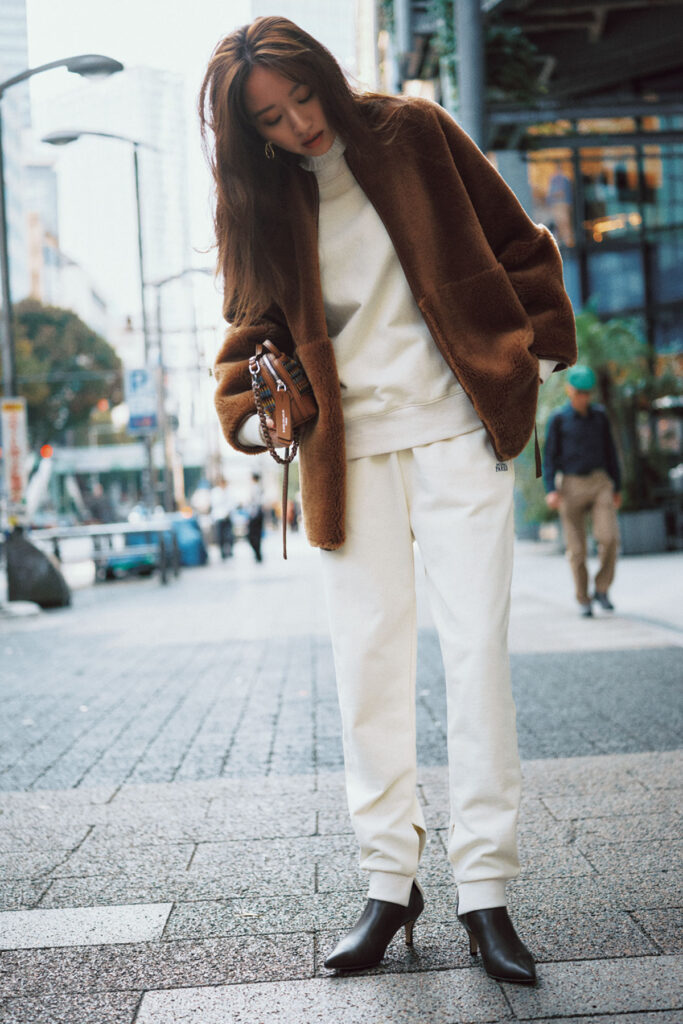 部屋着見えが心配なスウェットのセットアップは、ヒールとシャープなつま先のブーツでグッと都会的に引き寄せるのがカギ。ボアジャケットのリッチな質感も相まって、肩の力を抜きつつも、どこか意志のある冬スタイルに決まります。友達とのランチや鍋パなど、さりげなくオシャレを楽しみたい日におすすめ。