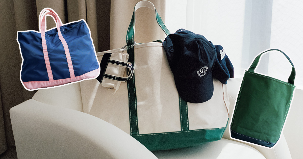 キャンバストートの元祖ともいえる、L.L.Bean。合わせる服を選ばず、彼とも一緒に使える大容量のシンプルトートは1泊旅行にも重宝。じゃらづけトレンドに乗っかって、まるでミニチュアのようなバッグチャームをつけて味変するのもオススメ。キャップやチャームをひっかけて、自分らしくカスタムするのも楽しい!バッグ¥12,100バッグチャーム¥3,300(ともにL.L.Bean/L.L.Bean カスタマーサービスセンター)帽子¥6,600(Sud Sud Ouest/BLUE IN GREEN)その他/スタイリスト私物