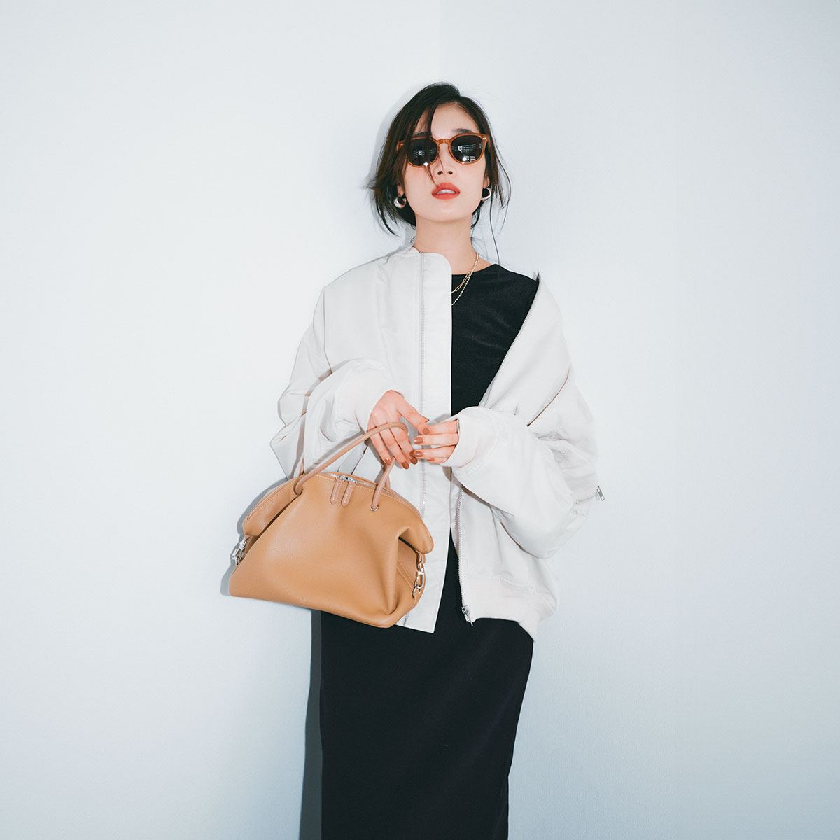 定番のMA-1も、オーバーサイズを選ぶことでぐっと今っぽく。リサイクルナイロン素材による軽やかなツヤが大人らしく、新鮮な印象にアップデート。白のオーバーサイズなのでぼんやり見えが心配ですが、黒ワンピと合わせることでモードな雰囲気に締まります。