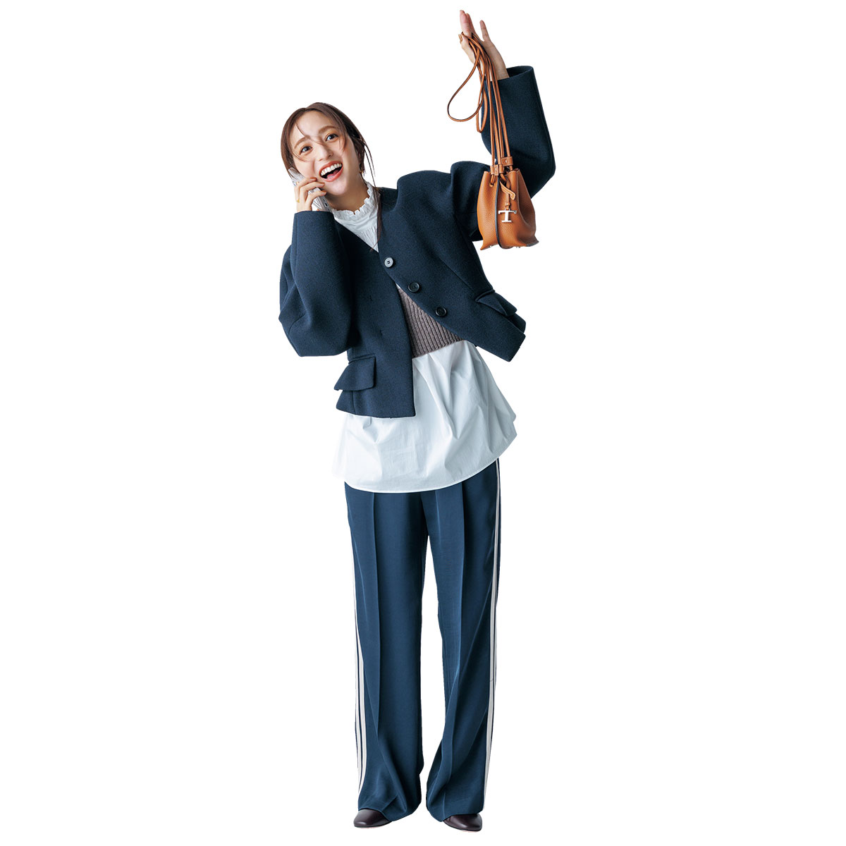 ハンサムなネイビージャケットは、シルエットの美しさで差がつく一枚。ドロップショルダーとウエストシェイプが絶妙な立体感を生み、羽織るだけでスタイルアップが叶います。お出かけシーンではフリルブラウスを合わせて、顔まわりに華やぎをプラス。ツヤのあるトラックパンツで、キレイめスポーティな着こなしを楽しんで。