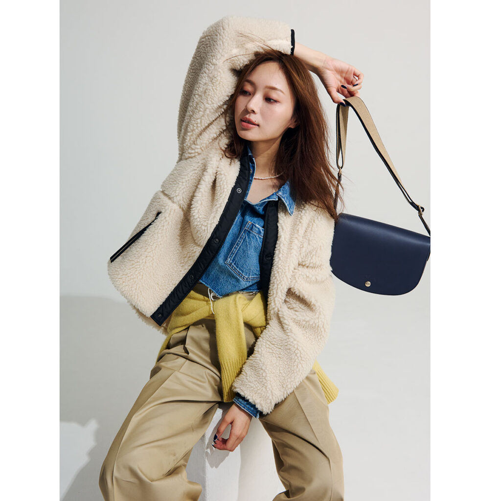 ふんわりとしたボアに、ブラックのパイピングがほどよいシャープさを添えるアウター。軽くて暖かく、厚手のニットを重ねても着膨れしにくいのが魅力です。デニムシャツでラフさを足しつつ、ネイビーのハーフムーン型レザーバッグでキレイめに仕上げるのがカギ。