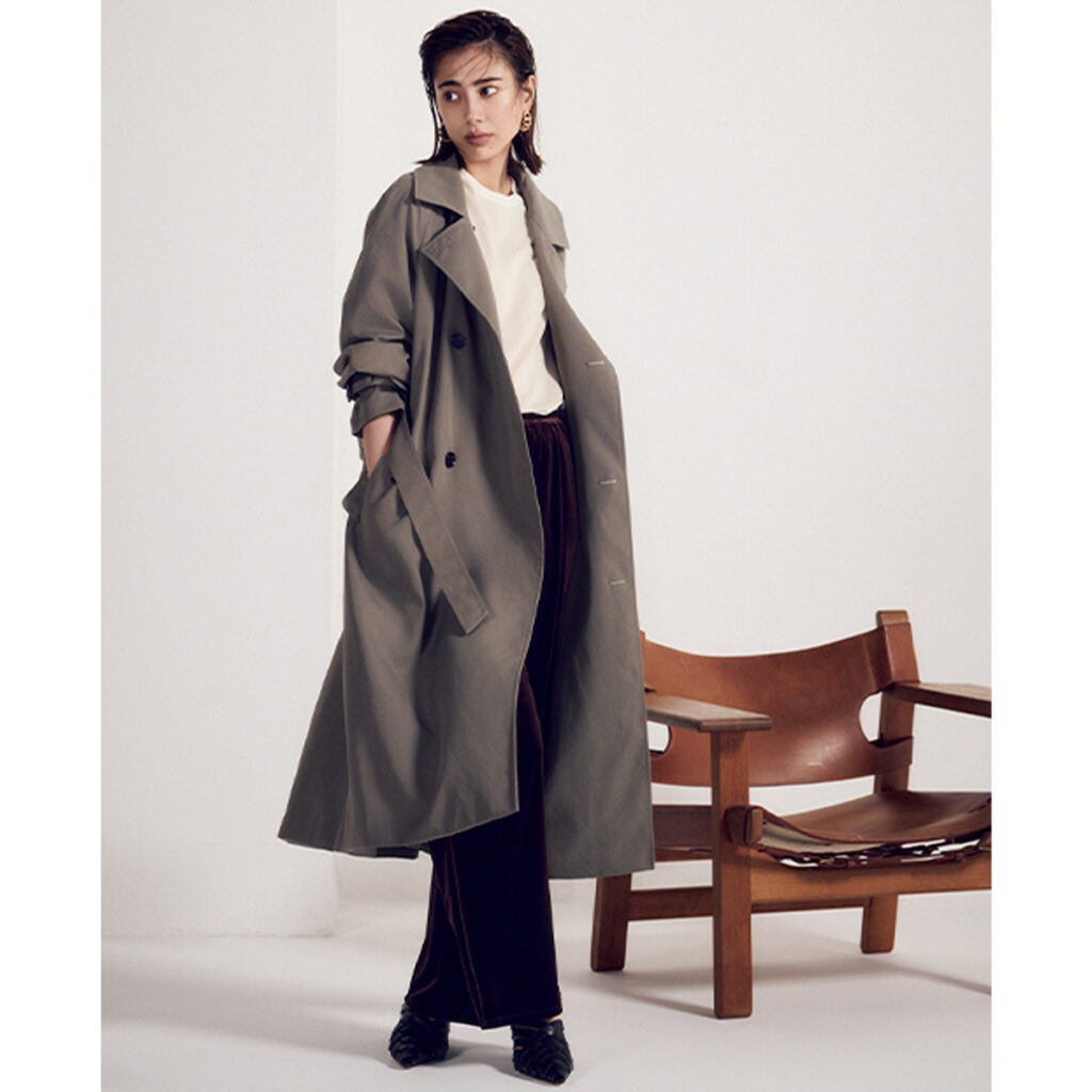 光沢のあるベロアパンツを上品に引き立てるのは、柔らかな風合いの撥水トレンチ。ほんのりツヤのある生地感が上品で、雨の日にも気負わず使えるのが嬉しいポイント。カーキ×ブラウンのシックな配色が沈まないよう、白トップスで明るさを添えればグッと清潔感ある装いに。