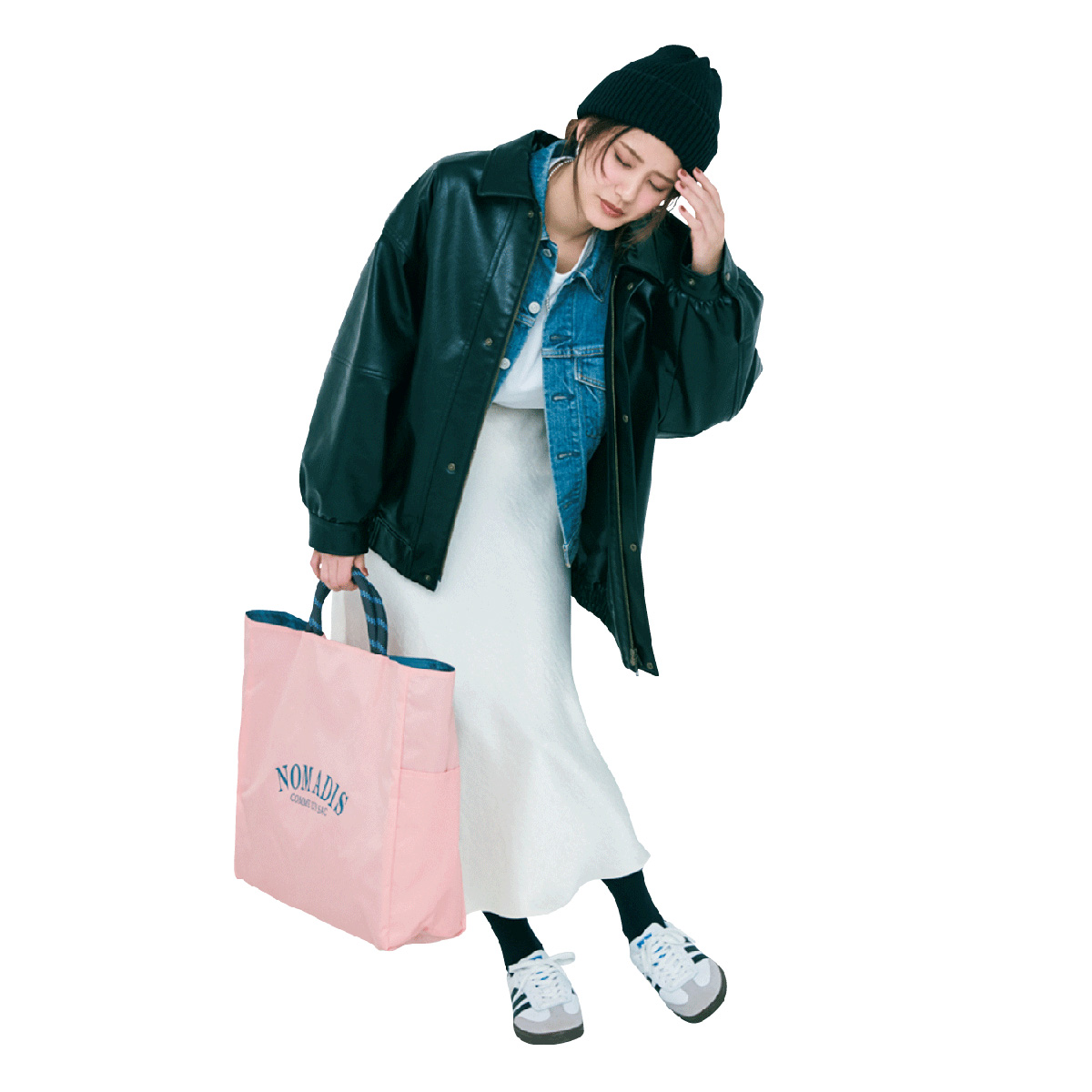 重ね着は着膨れして見えがちですが、ハリのあるレザー調ブルゾンならシルエットをすっきり引き締めてくれます。インにGジャンを仕込み、白のインナーとスカートでトーンアップすれば、軽やかさと抜けを両立。カジュアルな中にも洗練が漂う、今どきの休日コーデが完成です。