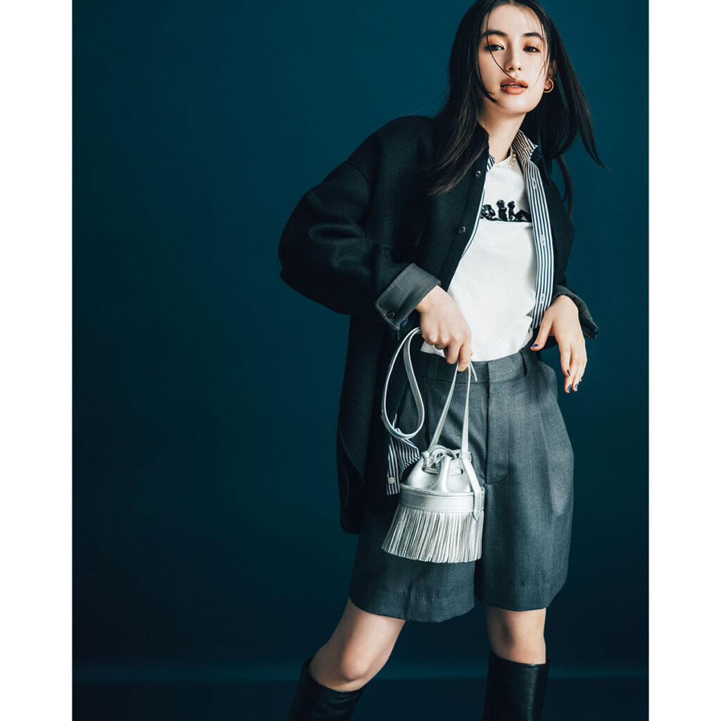 厚手素材のCPOジャケットは、シャツ感覚で羽織れるのにしっかり暖かく、初冬の軽アウターとしてぴったり。ストライプシャツのおかげで縦ラインが強調され、ゆったりシルエットでもすっきり見えが叶います。ショートパンツ×ロングブーツで脚をすらりと見せ、メンズライクな羽織りを女性らしく引き寄せて。