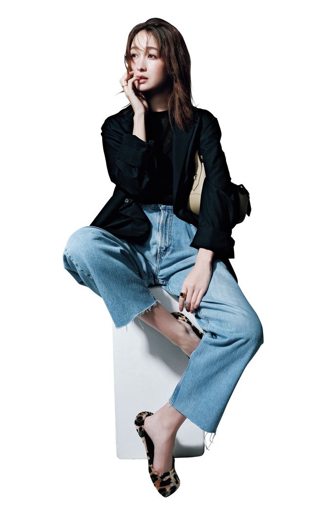 ワイドデニムに黒ジャケットのハンサムなスタイル。レオパード柄のパンプスはキツい印象もありますが、モコモコ素材なら可愛げもプラスされて絶妙なバランスになります。ハイウエストのワイドデニムはペタンコとも相性が良く、楽にバランスアップできるのも嬉しい。デニムパンツはプロシェ、靴はピッピシック、ジャケットはエイトン、タンクトップはミラ オーウェンのもの。