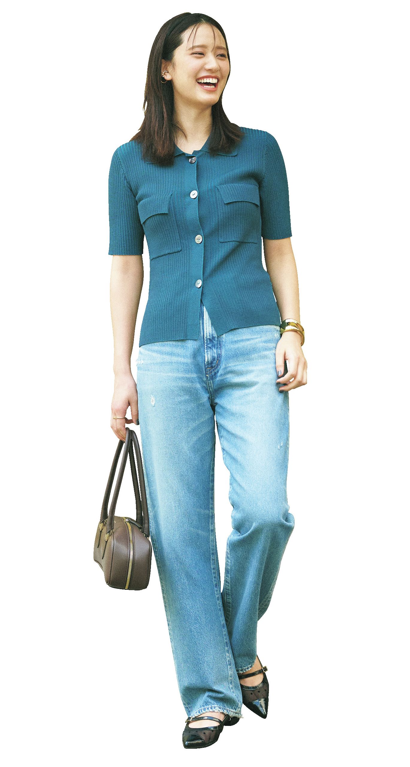鮮やかなグリーンのニット×薄色ゆるデニムのカジュアルコーデに華奢なヒール。そのアンバランスさが女っぽさを引き立てます。ブラウンのパンプスを選ぶことで、キツくならずナチュラルな仕上がりに。デニムパンツはディーゼル、ニットはセオリー、バッグはロンシャン、パンプスはネブローニのもの。