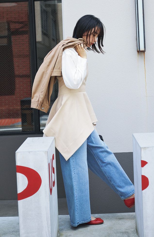 ペプラムビスチェとシャツのレイヤード、赤いパンプスという華やかアイテムたちをゆるデニムでカジュアルダウン。デニムに赤い靴は永遠にキュンとくる組み合わせ。ヒールだと女っぽすぎるので、バレエシューズで取り入れるのが正解です。デニムパンツはヤヌーク、靴はJ &Mデヴィッドソン、ビスチェはシーニュ、シャツはザ ポーズのもの。