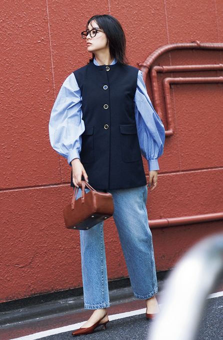 パンプスよりラフに仕上がるバックスリングパンプスが活躍。華やかな上半身とカジュアルなデニム、双方をいい具合に中和させる足元です。デニムパンツはザ シンゾーン、靴はペリーコ、ブラウスはランバン オン ブルー、ベストはエッフェ ビームス、バッグはア ヴァケーションのもの。