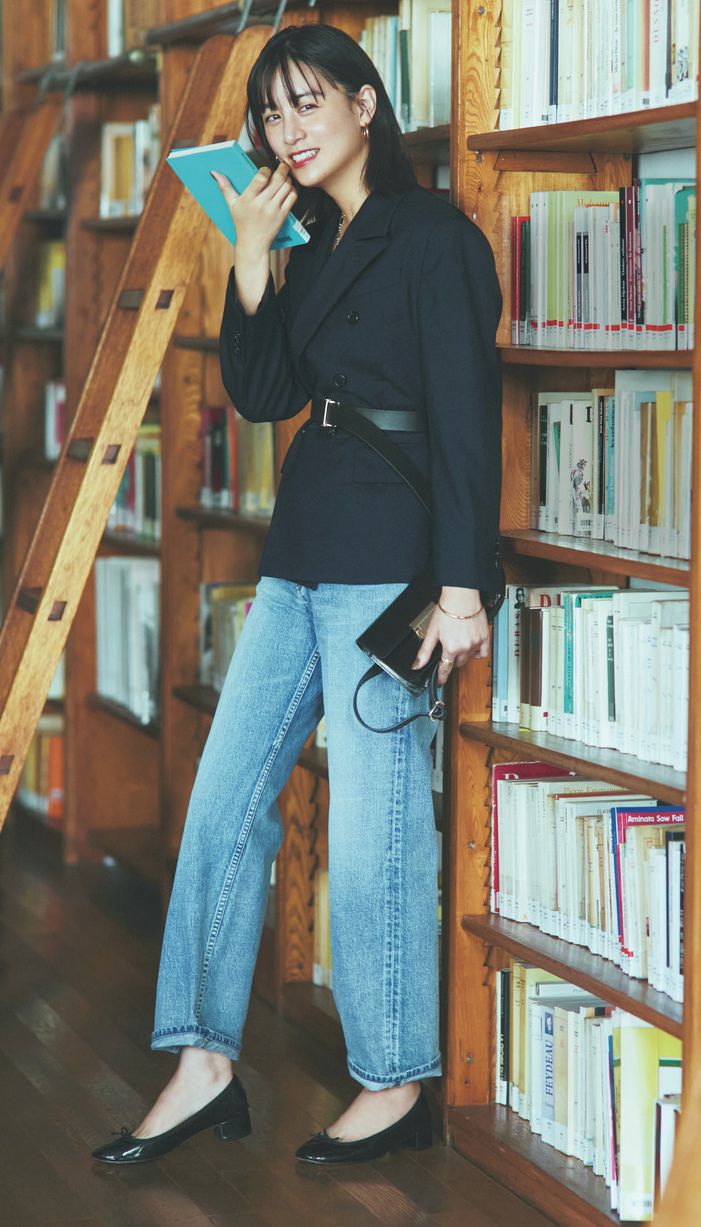 低めヒールのラウンドトウパンプスが上品。ハンサムなジャケパンスタイルが程よく女っぽく更新されます。これくらいのヒールなら、普段はスニーカー派だって取り入れられそう。デニムパンツはサードマガジン、パンプスはレペット、ジャケットはアンスクリア、ベルトはアトリエ アンボワーズ、バッグはモフィオラのもの。