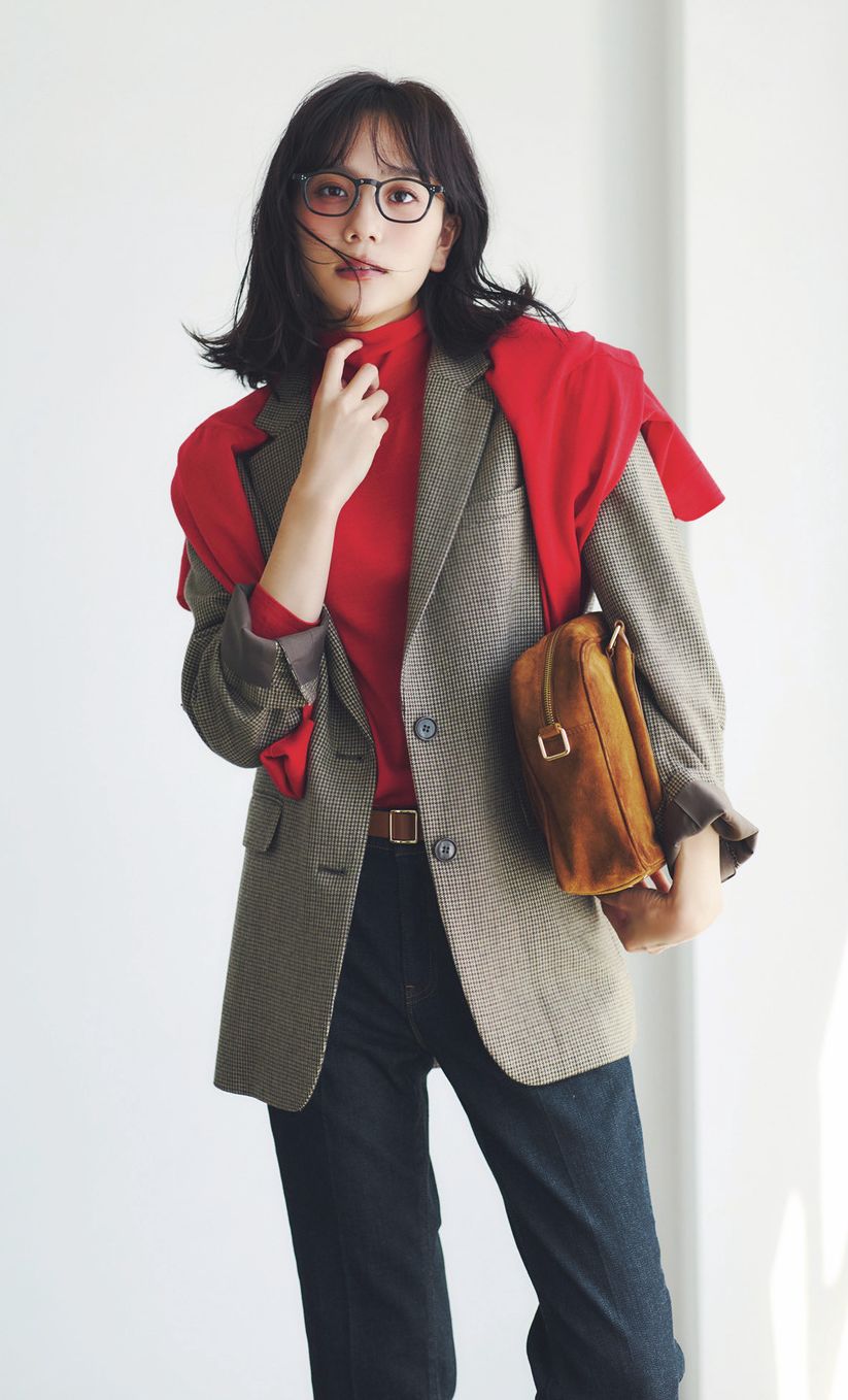 思い切ってカラータートルをイン。トレンドのブラウンチェックのジャケットは赤と相性が良く、鮮度高めのトラッドスタイルに。写真のパンツはデニムを合わせていますが、黒パンツやネイビーパンツでももちろん◎。オンにもオフにも似合うコーディネートです。ジャケットはハウント、ニットとカーディガンはノーリーズ、パンツはレッドカード、バッグはテラのもの。