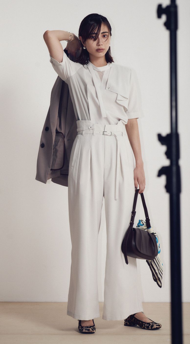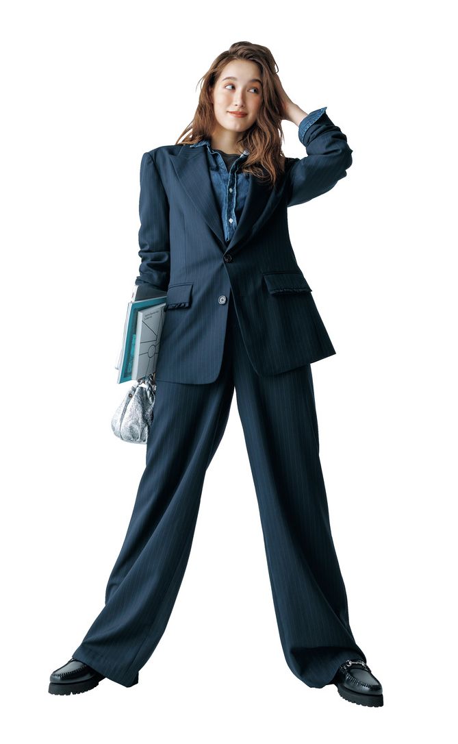 ジャケットの中にビスチェというのも今年らしい合わせ。ジャケットとビスチェが同素材ならよりきちんと見えするので、堅めの仕事シーンにも◎。ベーシックカラー同士や同色なら、セットでなくても問題なく合わせられます。ジャケット、ビスチェ、パンツはCIS、スニーカーはモエア、バッグはヴァジックのもの。