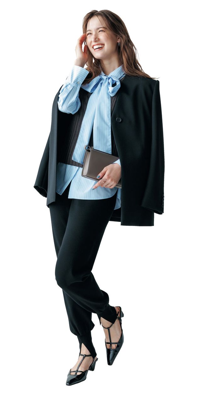 ビッグボウタイブラウスにニットを重ねてジャケットをオン。ニットを重ねることでブラウスの甘さが緩和され、また、ブラウスをアウトしたままでも好バランスになります。ジョガーパンツを合わせてハンサムな着こなしながら、会食などにも似合う華やかさも。ジャケットはプラステ、シャツはロペ ピクニック、ニットはデ・プレ、パンツはル フィル、バッグはボナベンチュラ、靴はダニエラ&ジェマのもの。