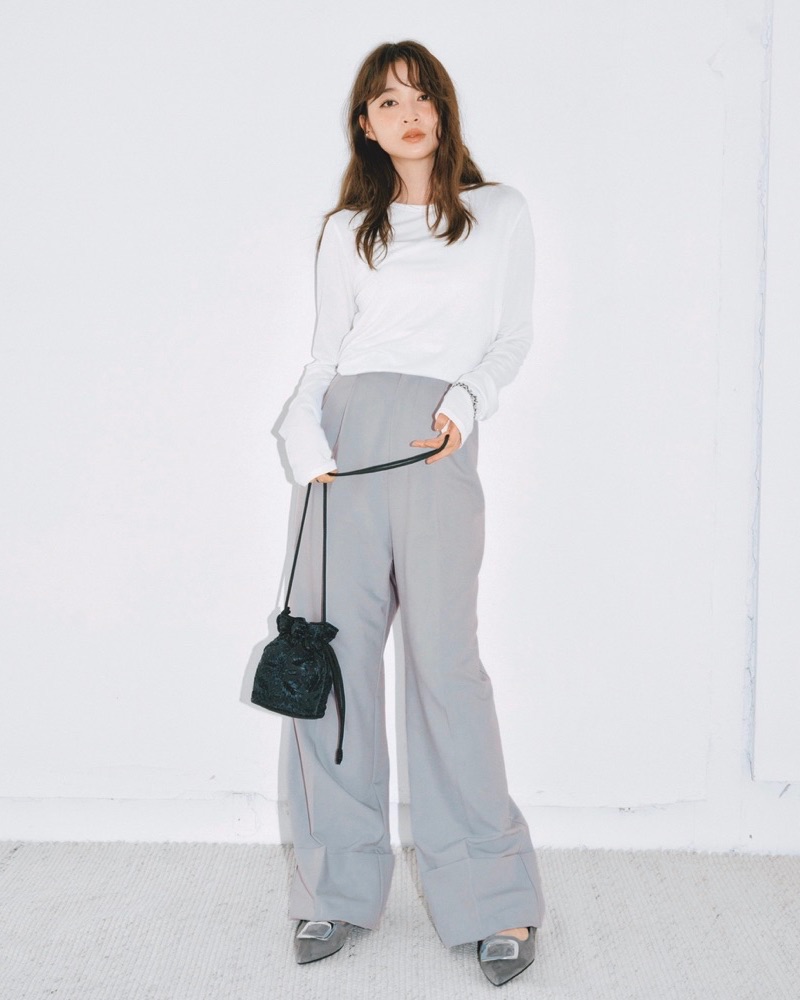 11月10日(月)、ほんのり透ける白のシアーTシャツで抜け感たっぷりに。生地の落ち感が美しいワイドパンツを合わせれば、シンプルなのに上品なムードに仕上がります。ミニバッグとヒールでバランスを整えて、ミニマルコーデをぐっと格上げ。カジュアルにきれいめアイテムをゆるっと合わせるだけで、“引き算のオシャレ”が完成です。