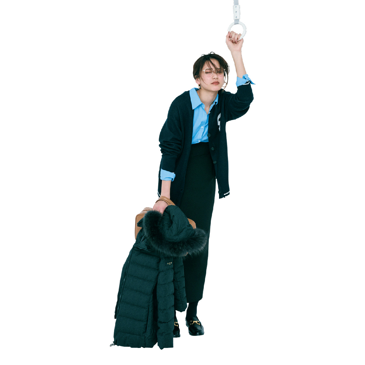 パリッとしたブルーシャツと黒のタイトスカートでつくるIラインシルエットは、全身をすっきり引き締めて見せる鉄板コンビ。そこにカーディガンを重ねることで、ほどよく力の抜けたムードと奥行きが生まれます。ローファーとメガネを添えれば、知的で今っぽい通勤スタイルが完成。