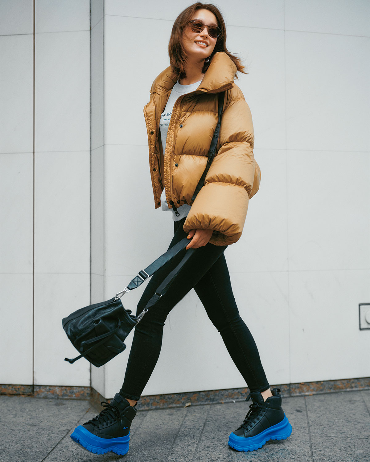 ボリュームのあるショートダウンは、コンパクトな黒スキニーを合わせてメリハリをつけるのが正解。脚のラインを引き締める黒パンツのおかげで、ダウンのふくらみが逆に華奢見えを後押しします。厚底ブーツで重心を上げれば、スタイルアップ効果も抜群。