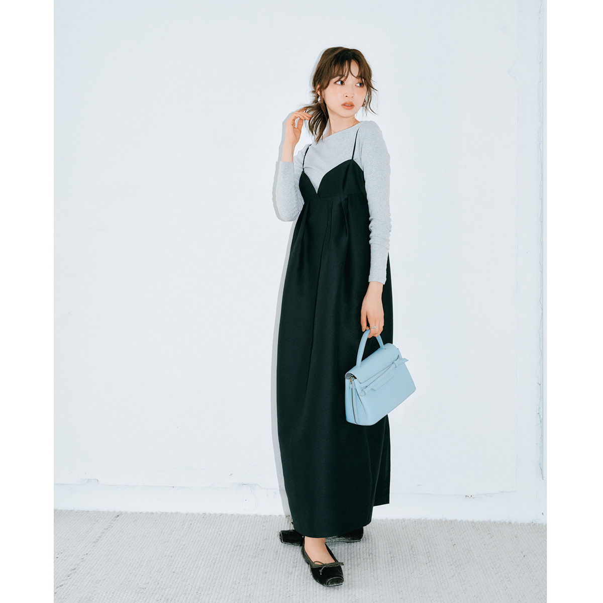 黒のキャミワンピは、縦に落ちるIラインシルエットで全身をすらっと見せてくれる一枚。インナーにグレーのカットソーを仕込めば、立体感が生まれて着膨れ知らず。華奢ストラップと軽やかな素材感が、冬の重さを払拭してくれます。仕上げにブルーバッグで品のよさをプラスして大人っぽく。