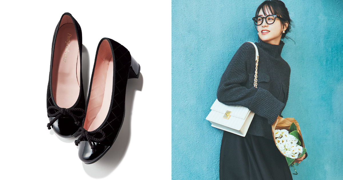王道のモデルのみならず、トレンドを取り入れた遊び心あるデザインが豊富に揃う。ベロア素材のキルティングステッチに太めのコードリボンがアクセントのバレエヒールは、履くだけでレディな雰囲気を後押ししてくれます。ベロアキルティングシューズ[H4cm]¥38,500(プリティ・バレリーナ/F.E.N.)ニット¥39,600(サクラ/インターリブ)シアースカート¥31,500(シーニュ)バッグ¥68,200(ケイト・スペード ニューヨーク/ケイト・スペード カスタマーサービス)メガネ¥46,200(アイヴァン/アイヴァン 東京ギャラリー)ピアス¥6,820(アビステ)