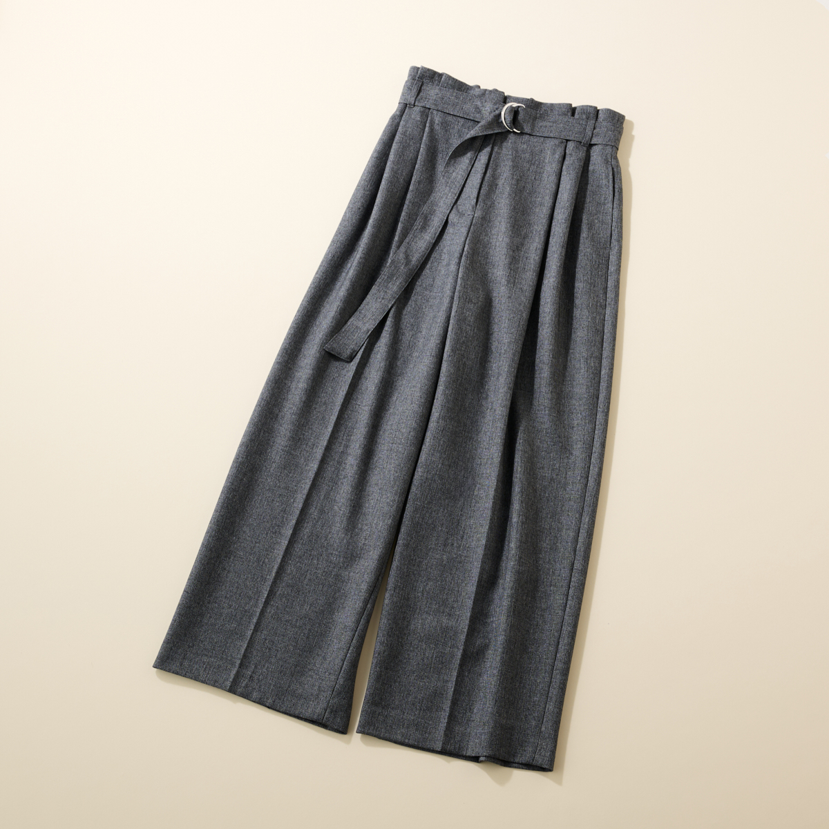 2タック入りのシルエットが美しい、ツイード見えのワイドパンツ。ベルトと上端フリルでウエスト位置をしっかりマーク。腰回りも程よいゆとりがあり、気になるヒップラインもカバーしてくれる万能デザインです。微ストレッチ素材なので、はき心地抜群。生地の表面はフラットなので冬本番~暑い時期まで長く着られます。