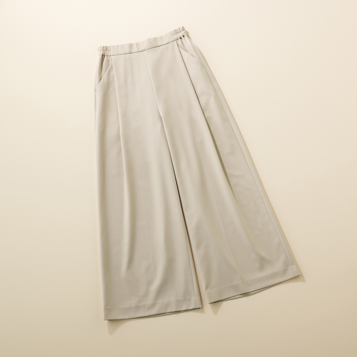 「誰でも綺麗に、心地よくはける」をコンセプトに開発された、ノンストレスなタックワイドパンツ。秋冬のイヤな静電気を軽減してくれる放電テープ付きで、ファスナーなし&バックウエストゴムで脱ぎ着ラクチン。股上深めなタック入りデザインで脚長効果も。柔らかな肌触りのウールライク生地で、秋口から冬まで長く着られます。