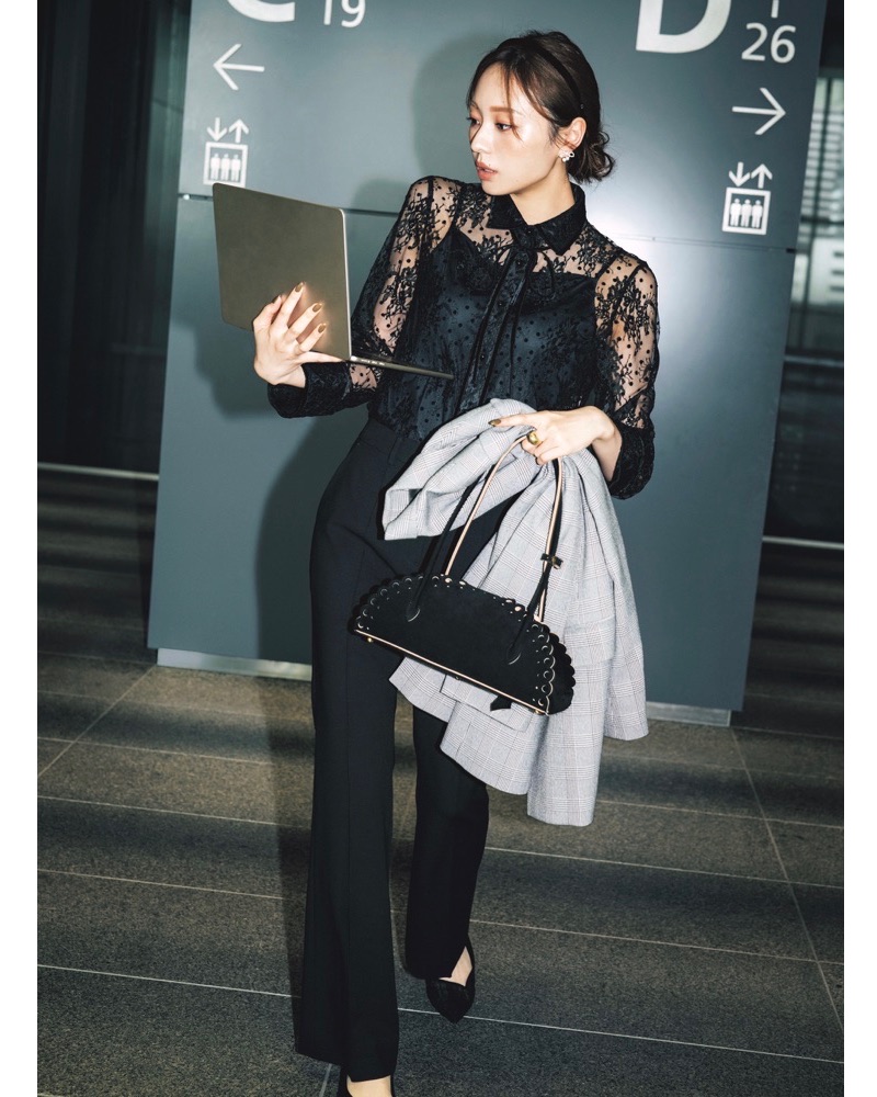 11月19日(火)、透け感のあるブラックのレースブラウスが主役の日。センタープレス入りの黒パンツを合わせて、脚長効果とともにきちんと感をプラスして。グレンチェックのジャケットを使えば、モノトーンでも重くならず、抜け感のある印象になります。「オールブラック×レース」で作る、大人のハンサムフェミニンが完成です。