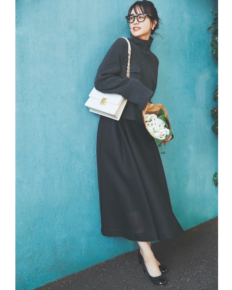 11月21日(金)、深みのあるチャコールグレーのリブニットに、ほんのり透ける黒のシアースカートを合わせて軽やかに。 ゆるいシルエットながら丈感はコンパクトで、女性らしい抜け感を演出します。 白のバッグでクリーンな抜け感を、エナメルの黒パンプスで足元に艶をひとさじ。 メガネをプラスすれば、シックなワントーンコーデに知的さを添えられます。 異素材の組み合わせで、黒×グレーの装いを軽やかに見せる大人のデイリースタイルです。